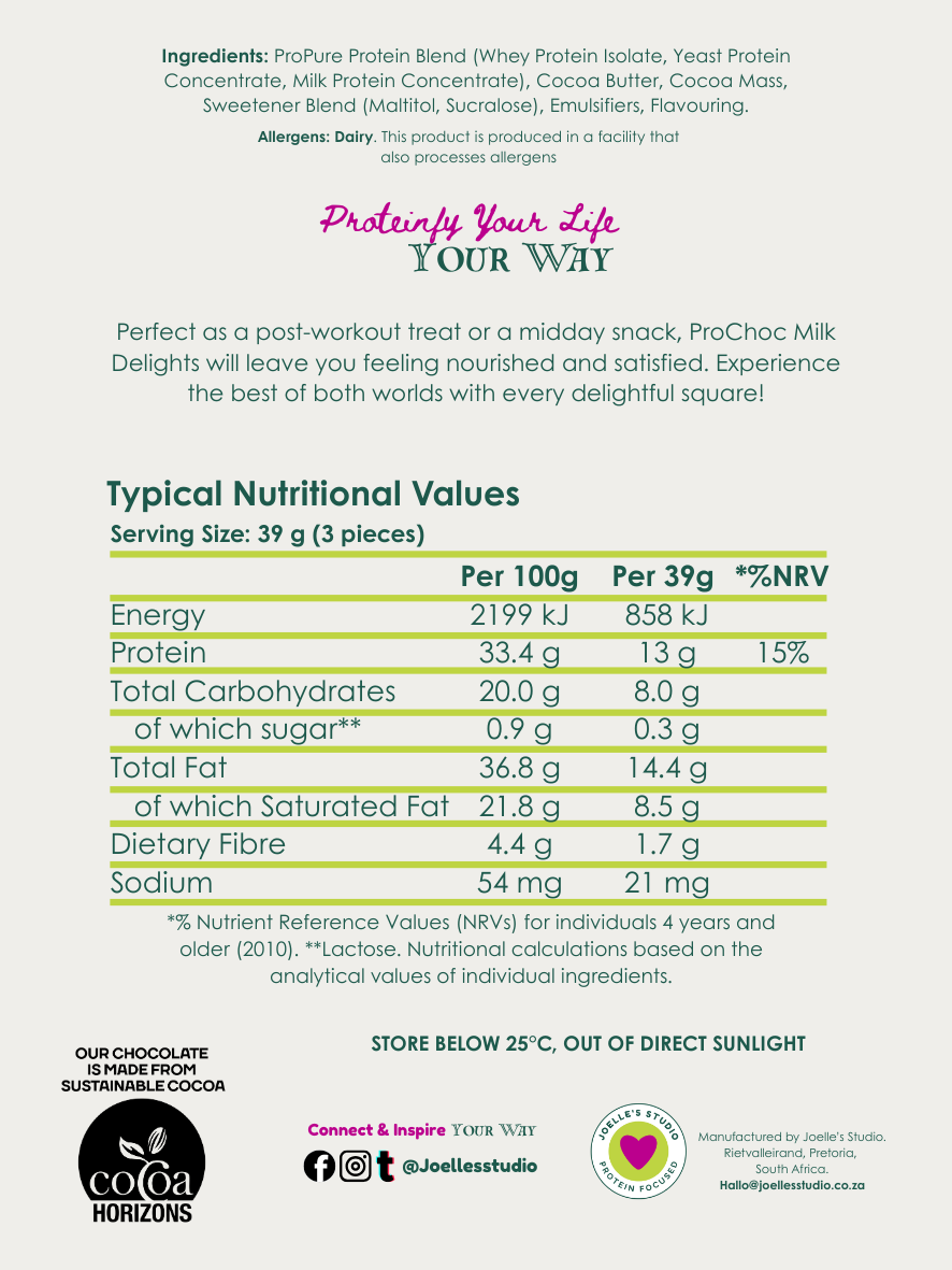 Perfect as a post-workout treat or a midday snack, ProChoc Milk Delights will leave you feeling nourished and satisfied. Experience the best of both worlds with every delightful square!